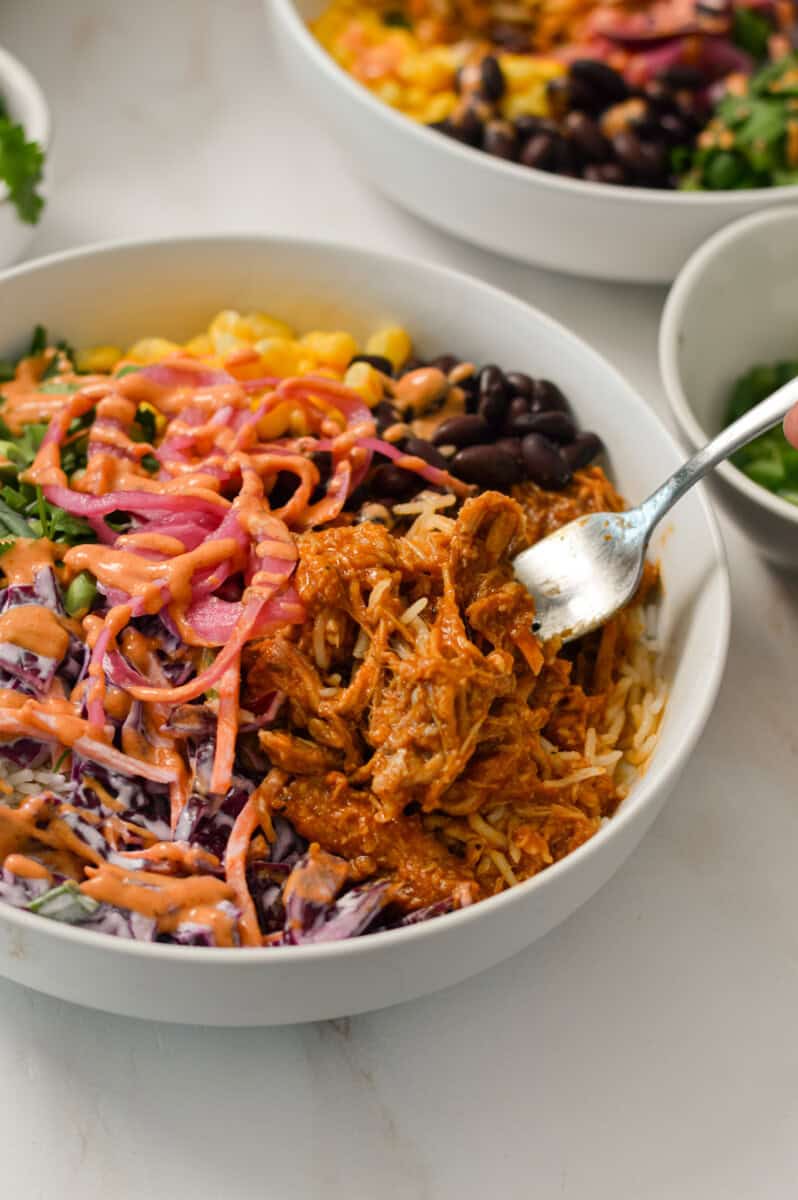 If you love easy slow cooker meals like my Slow Cooker Southwest Chicken Bowls or Crockpot Green Chili Chicken, this pulled pork bowl is another great one to add to your rotation. Once the shredded pork is ready, you can build a customizable bowl with toppings like coleslaw, corn, black beans, cilantro, and my pickled red onions. It's simple, satisfying, and a great option for both weeknight dinners and meal prep.