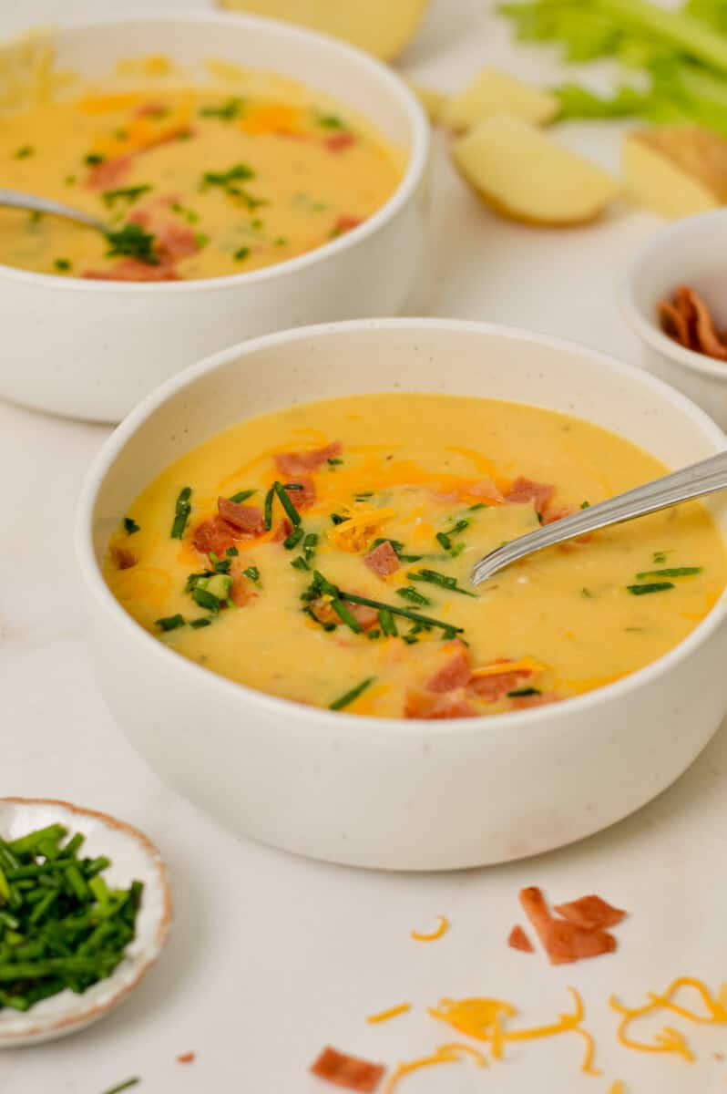 - If you prefer for a chunkier soup you can add additional bacon, chives and cheddar directly into the soup!