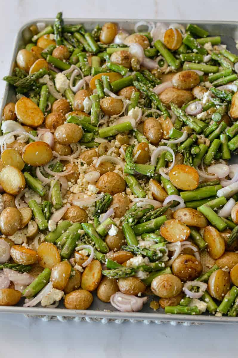 - Once the potatoes are cooked, add the asparagus, shallots, feta and green olives to the pan. Toss with the remaining 1 tablespoon of olive oil and the other half of the salt/pepper/parika spices.