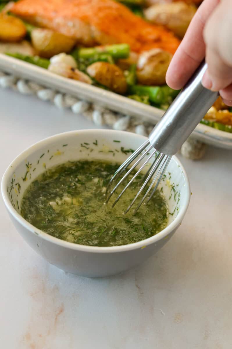 - While baking, make the lemon dill butter sauce by whisking together melted butter, lemon juice, fresh dill, lemon zest and garlic.