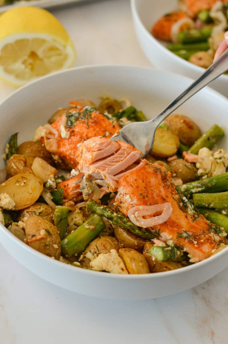 This Sheet Pan Lemon Dill Salmon and Asparagus is an easy, one pan dinner made with tender salmon, roasted asparagus, and crispy potatoes, all finished with a bright lemon dill butter. It's a simple, balanced meal that's perfect for busy weeknights.