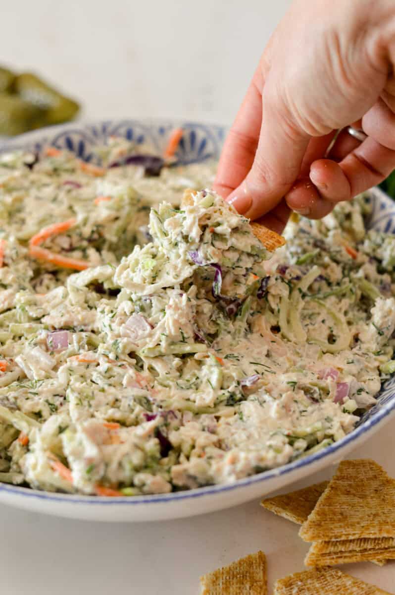 This spicy dill pickle chicken salad can be stored in an airtight container in the fridge for up to 3-4 days.